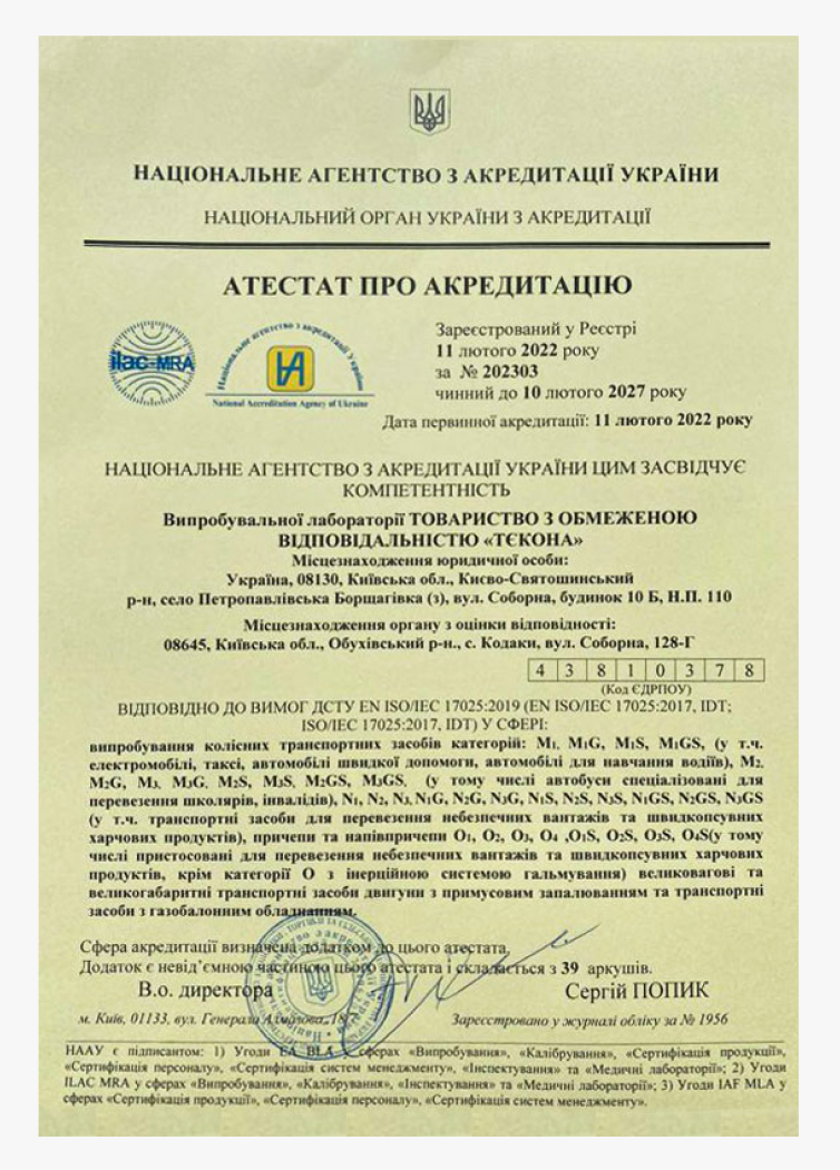 Лабораторія ТЕКОНА оснащена сучасним обладнанням, що акредитоване НААУ і відповідає всім вимогам національного стандарту ДСТУ EN ISO/IEC 17025:2019 (EN ISO/IEC 17025:2017, IDT; ISO/IEC 17025:2017, IDT), для проведення технічного огляду, сертифікації, переобладнання всіх категорій автомобілів